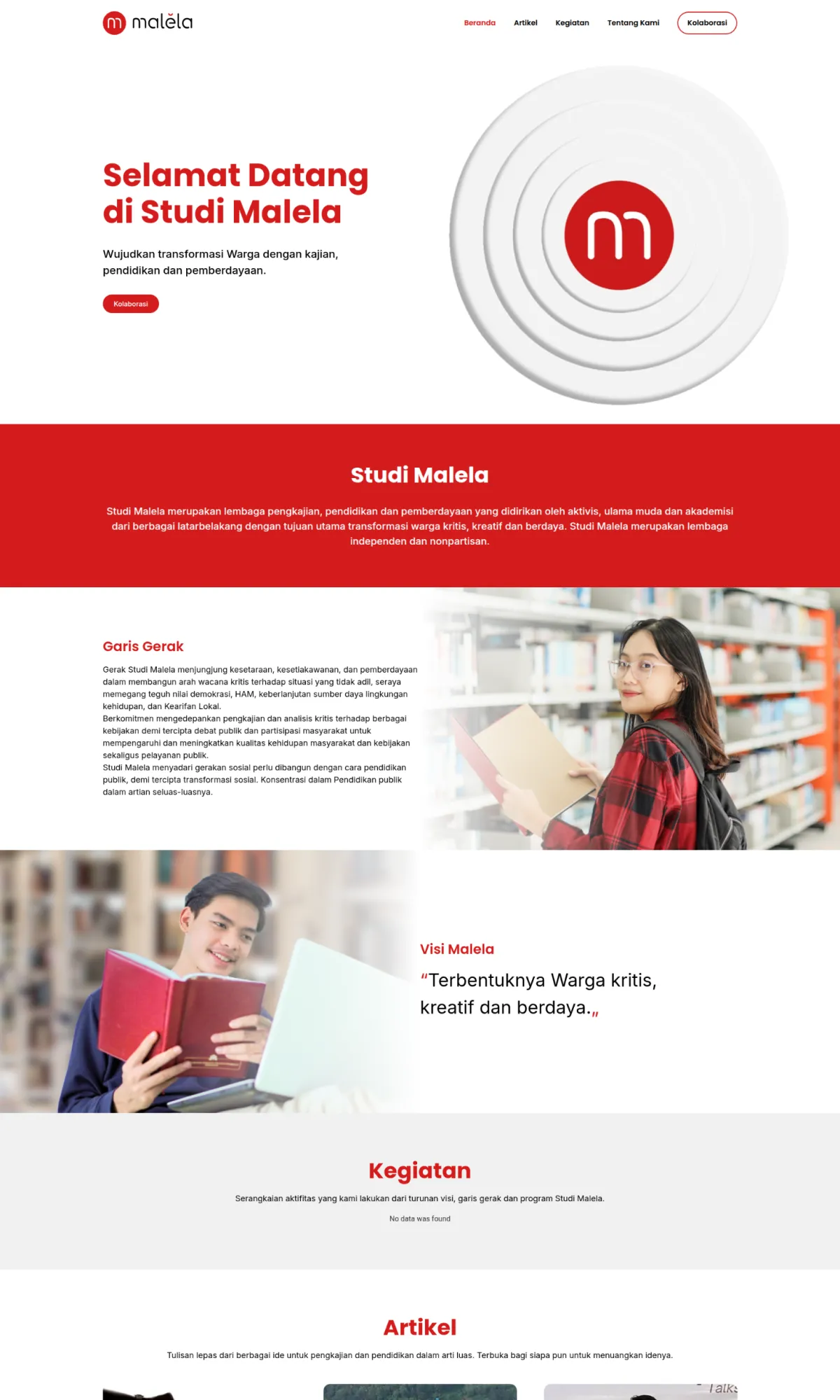 Studi Malela adalah yayasan independen yang berdedikasi pada transformasi warga melalui penelitian, pendidikan, dan pemberdayaan masyarakat. Website ini dirancang sebagai platform komunikasi utama untuk menyebarkan misi organisasi dalam menciptakan warga yang kritis, kreatif, dan berdaya.
